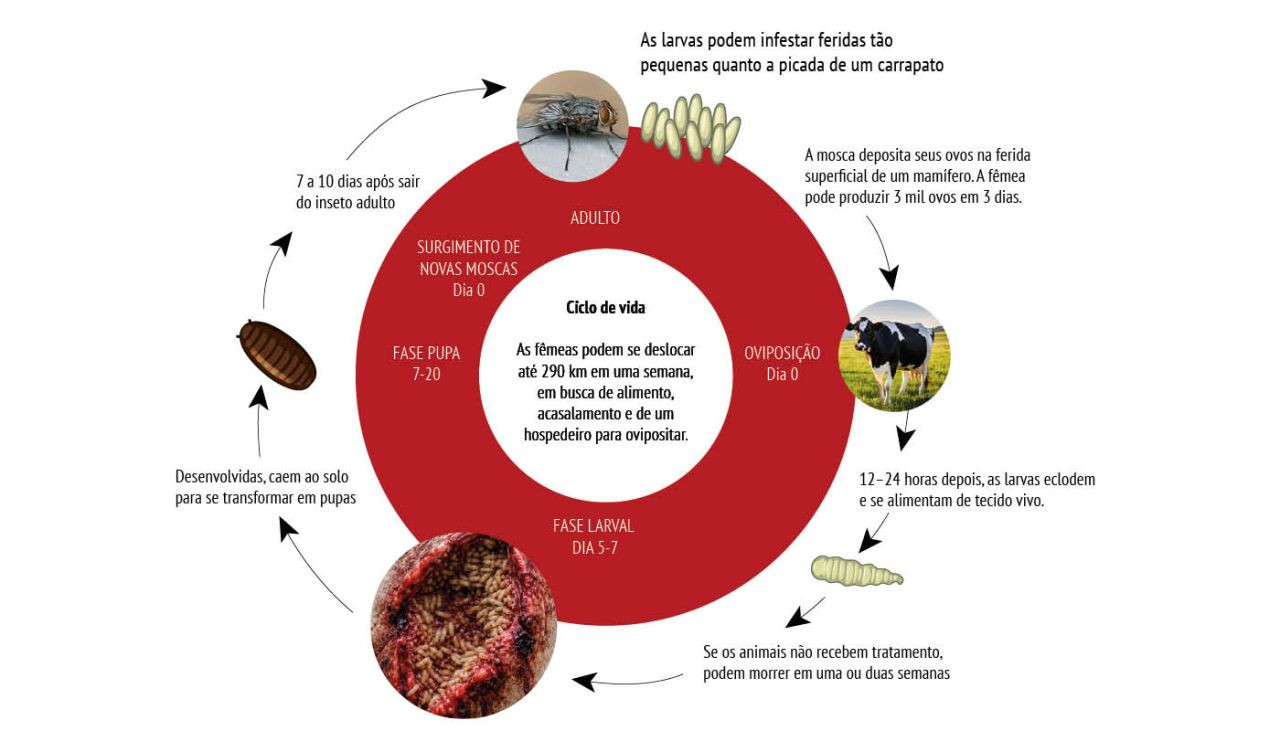 O clima quente e úmido, comum do início do verão até março, cria o ambiente ideal para a multiplicação das moscas, principalmente a Cochliomyia hominivorax. Com isso, feridas pequenas, muitas vezes passadas despercebidas, tornam-se portas de entrada para as larvas.